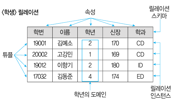 릴레이션은 데이터들을 표의 형태로 표현한 것으로 구조를 나타내는 릴레이션 스키마와 실제 값들인 릴레이션 인스턴스로 구성